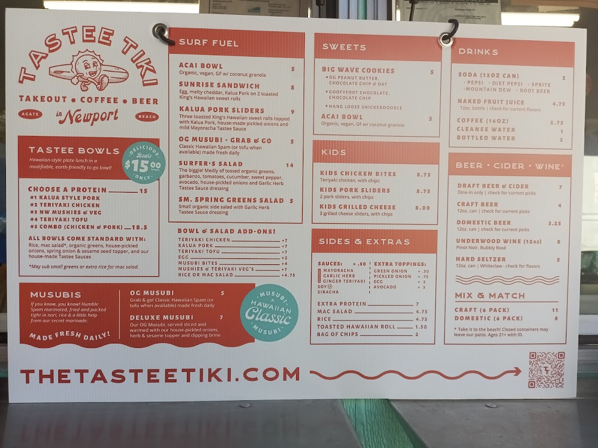 Welcome to Tastee Tiki, a culinary gem nestled at Ossies Surf Shop in Newport, OR. This Hawaiian-inspired food cart brings a burst of flavor and warmth to your dining experience. Customers rave about the steaming bowls filled with tofu, chicken, and the show-stopping Kalua pork. The generous portions ensure you leave satisfied, while the vibrant outdoor seating creates a lively atmosphere enhanced by live music.
